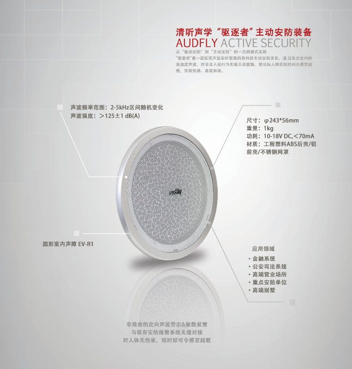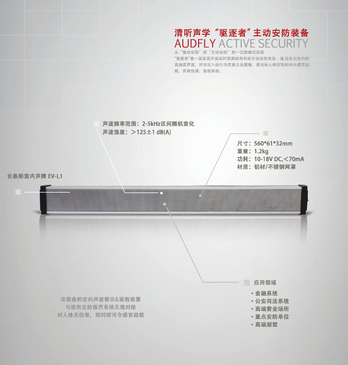 “驅逐者”是一款基于聲波技術進行遠/近距離驅離的主動安防裝備,是目前國際先進的可在事中階段有效干擾犯罪行為,驅離驅逐犯罪分子的主動安防系統(tǒng)。