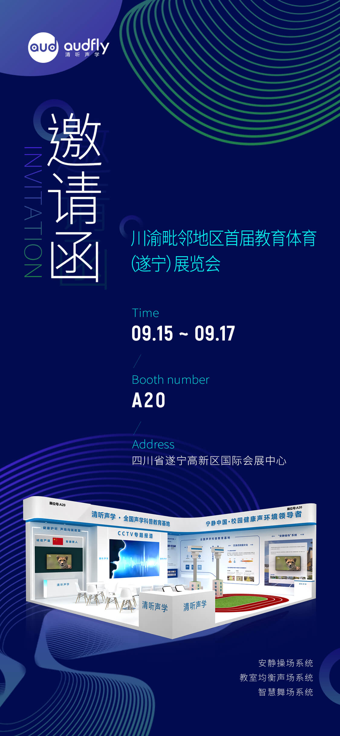 9月15日-9月17日,川渝毗鄰地區(qū)首屆教育體育(遂寧)展覽會將在四川省遂寧高新區(qū)國際會展中心舉辦,清聽聲學(xué)攜安靜操場系統(tǒng)、教室均衡聲場系統(tǒng)、智慧廣場舞系統(tǒng)參展,邀請您蒞臨現(xiàn)場,感受聲學(xué)科技的魅力!